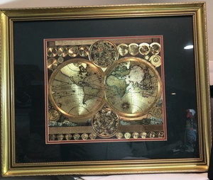 Vintage Gold Foil World Map Double Hemisphere 25×31 Framed Wall